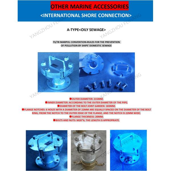 International Shore Connection is a brand name of FEIHANG, which is a professional manufacturer of sewage shore connection equipment. With model number A, AS, B and BS-type, this product is made of carbon steel and stainless steel material with hot-dip galvanized and epoxy paint surface treatment. It is certified by factory certificate, test report and material report. It is suitable for sea water with working pressure of 3.0MPa. The minimum order quantity is 1pcs, and the price is discussed personally. The delivery time is 1-2 days, and 100 pcs can be supplied in one day. It is mainly used for oil sewage, domestic sewage and fire protection. The packaging is export packaging, and the payment term is 100% prepaid.